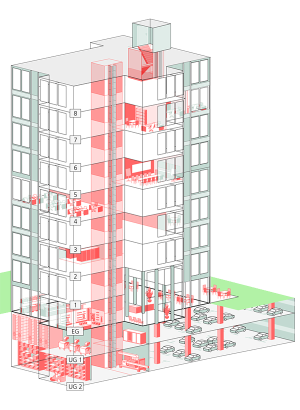 Kitchen Archive Storage Room Waste Disposal Shops and Sales Utility Room Emergeny Power Generator Atria Parking Areas Server Room Offices Riser Duct